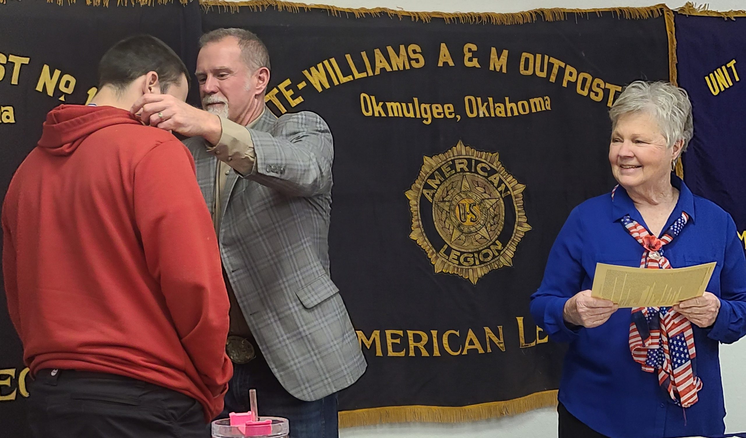 Senator Warren Hamilton recognizes a member of the Legion following their completion of the program.