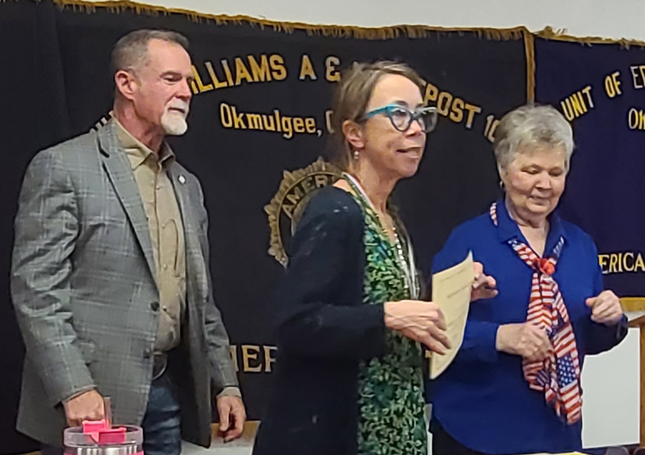Senator Warren Hamilton watches as one of the members receive their certificate from Patti Ogden.